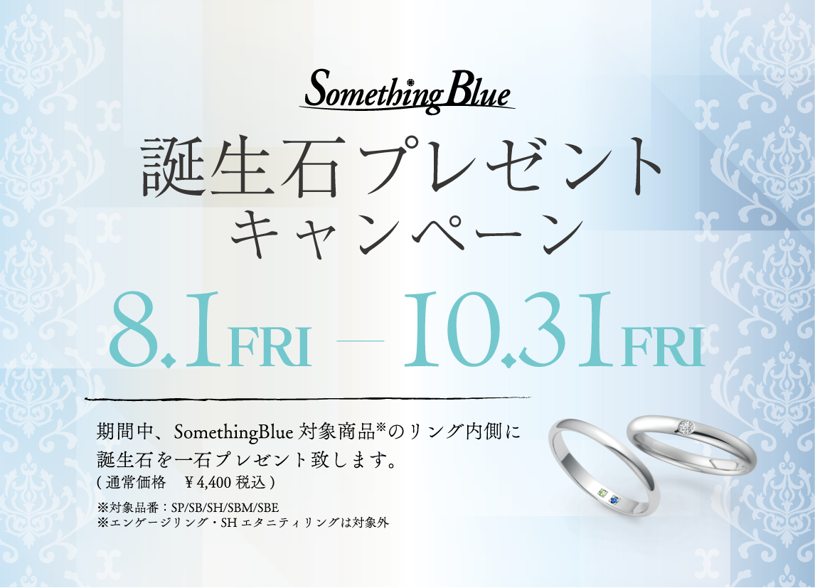 NEWS 新着情報 TOP 新着情報 【Something Blue】誕生石プレゼントキャンペーン☆ 【Something Blue】誕生石プレゼントキャンペーン☆ 2025.08.01 2025年8月1日(金)~2025年10月31日(金)までの開催期間中に 【Something Blue】のご結婚指輪をご成約いただきますと、 指輪の内側に誕生石を1石プレゼントいたします☆ ※対象品番:SP,SB,SH,SBM,SBE (エンゲージリング・SH エタニティリングは対象外) ※誕生石は、≪幸運を招き、災いを払い、願いを叶えてくれる≫といわれています。 この機会に、お二人の大事なお誕生石を、ぜひご一生物のご結婚指輪にどうぞ♪ ご来店予約はこちらから